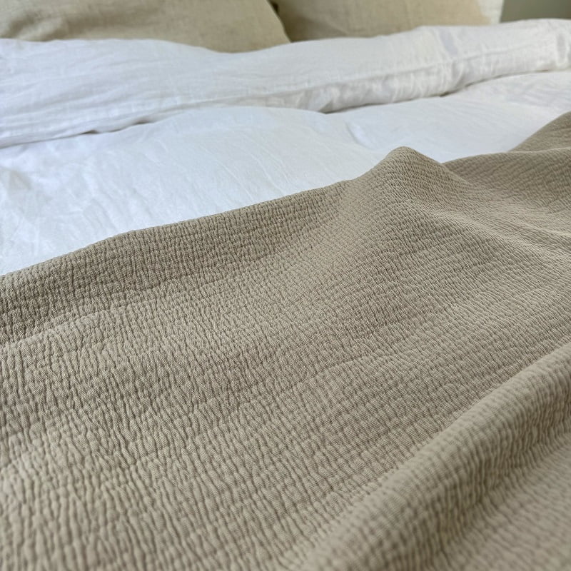 Beige sprei Hunter in 3 maten is volop voorraad en 24 uur per dag te bestellen op www.lievelingslinnen.nl of tijdens openingstijden in de winkel in Barneveld