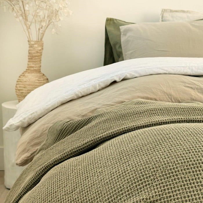 Everest sprei olijf groen van washed cotton is volop voorraad en 24 uur per dag te bestellen op www.lievelingslinnen.nl of tijdens openingstijden in de winkel in Barneveld
